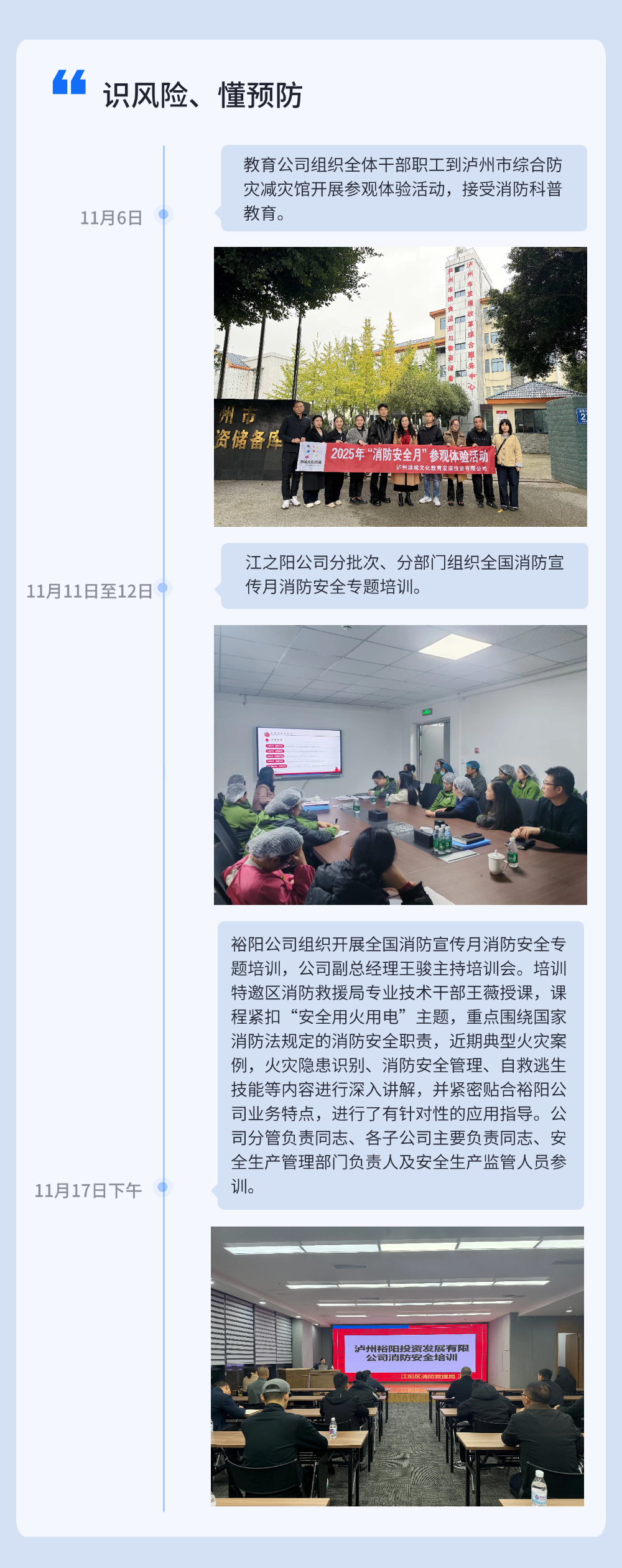 11月份,裕阳公司严格落实重污染天气防控要求,深入开展全国消防宣传月活动,安全生产各项工作有序推进。所属各子公司累计召开安全和环保工作有关会议7次,组织开展各类安全检查20次(其中安全专项检查7次,常规安全检查13次),实施安全专题培训及演练共6次(涉及消防安全、食品安全等领域),实现安全隐患排查整改率100%,公司整体安全形势保持稳定。